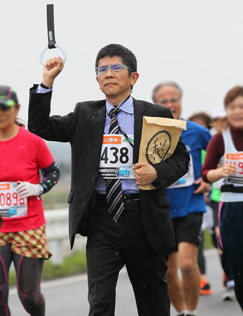 5回目ということで、いつもと違った「遊び心」を入れようと、スーツにネクタイ、革靴を履き、完全なサラリーマンの通勤スタイルという、全身仮装でレースに挑みました。