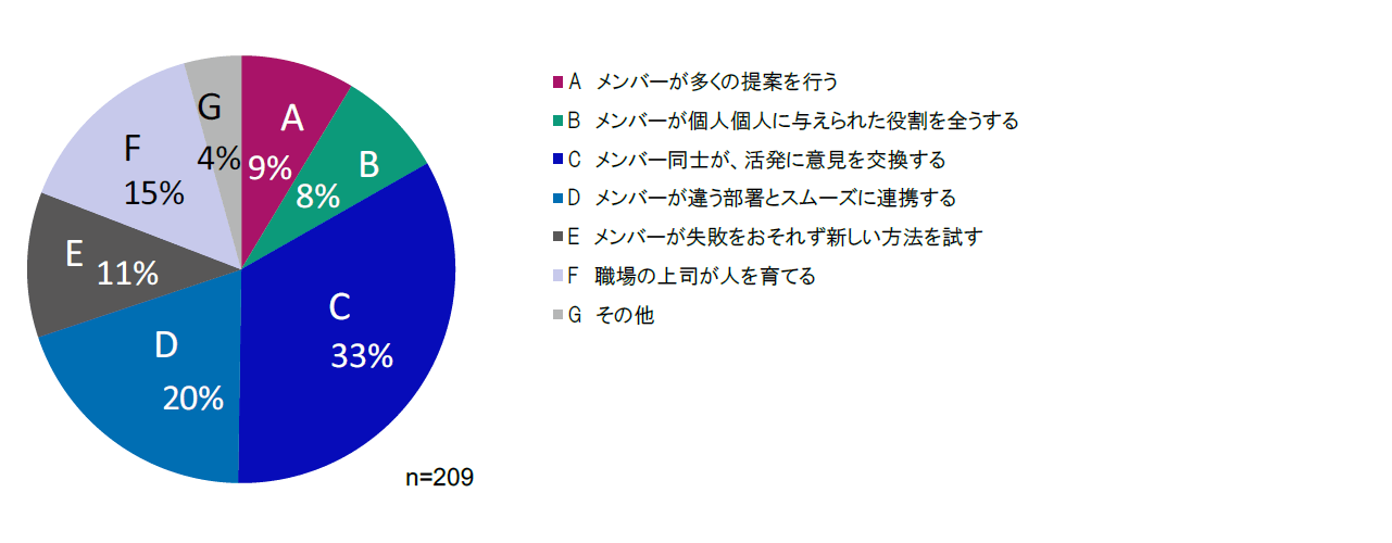 継続的に業績を向上させるために必要な組織風土として、「C メンバー同士が、活発に意見を交換する」を選んだ人が33%と一番多い結果となった。2番目は、「D メンバーが違う部署とスムーズに連携する」で20%、3番目は、「F 職場の上司が人を育てる」で15%であった。社員同士のコミュニケーションを重視している回答が多い傾向となっている。