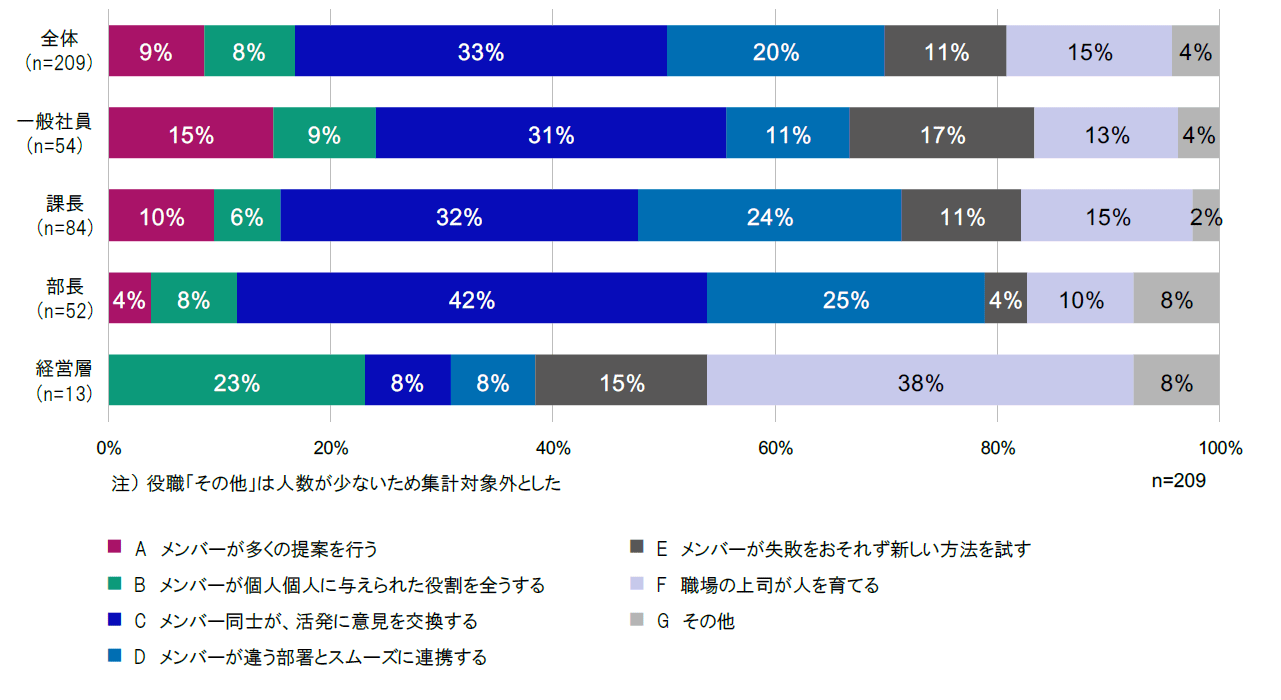 課長・部長は、「C 活発な意見交換」「D 部署連携」の割合が大きく、一般社員は、課長層と傾向が似ているものの、「A