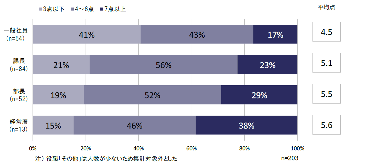 経営層の回答者数は少ないものの、他役職とは違う傾向がみられる。特に「F 上司が人を育てる」については、経営層は管理職が人を育てることを重要視していることが分かる。