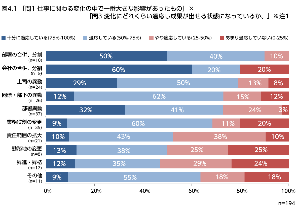 「適応している」「十分に適応している」を選択した人の割合をみると、「部署や会社の合併・分割」に関する項目が上位2項目となっている。それに続いて「上司や同僚・部下の異動」が3,4位と続く。上位は、自分自身に起きた変化ではなく周囲に起きた変化に関する項目となった。
