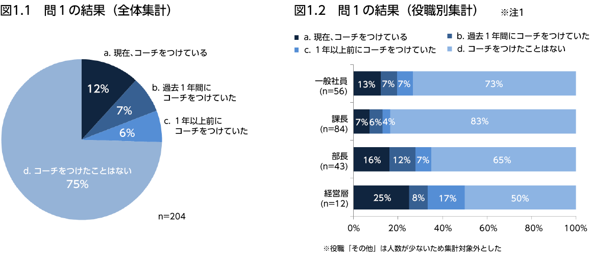 役職別では、どの役職層でもコーチをつけた経験があり、課長を除き上位職ほどコーチをつけた経験が多い結果となった。