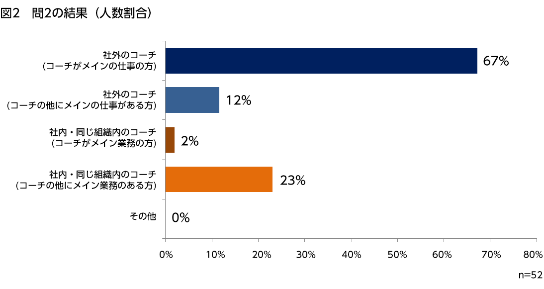 コーチをつけた経験のある人のうち67%は、社外のコーチ(コーチをメインの仕事にしている人)からのコーチングを受けているという結果となった。また、社内のコーチは、他にメイン業務がある人が行っているケースがほとんどであることが分かった。