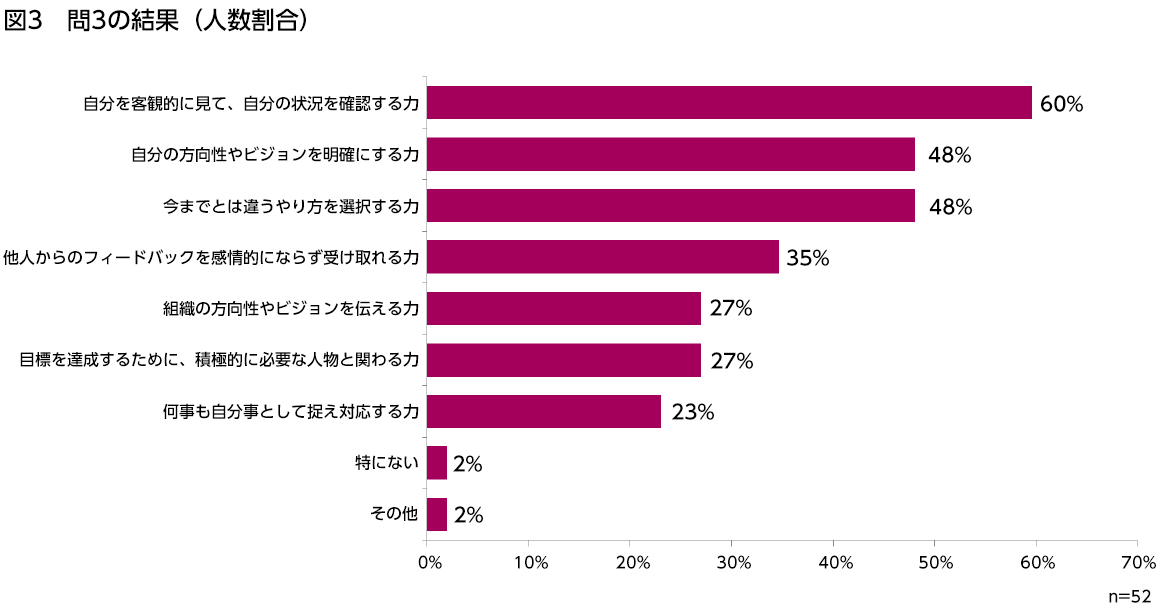 コーチをつけたことで向上する能力として一番選ばれた項目は、「自分を客観的に見て、自分の状況を確認する力」60%であった。それに続き、「自分の方向性やビジョンを明確にする力」「今までとは違うやり方を選択する力」が共に48%であった。以上の3項目はコーチングを受けた約半分の人が効果として実感している項目と言える。