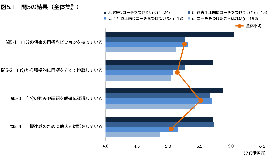 問5-1、2、3で「現在、コーチをつけている」人たちが一番高いスコアとなった。問5-4でも僅差の2位になっている。これより、現在コーチを付けている人たちは、他の人たちよりも、明確な目標、積極的な挑戦などを有していると考えられる。また、過去にコーチをつけた経験のある人たちは、コーチをつけたことはない人たちよりも、全設問においてスコアが高かった。「コーチをつけたことはない」人たちは、全設問において一番低いスコアとなった。