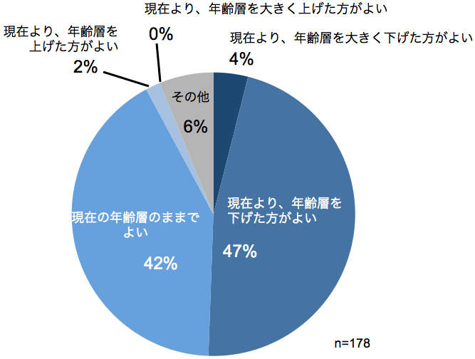 「現在より、年齢層を下げた方がよい」 「現在より、年齢層を大きく下げた方がよい」 をあわせると51%となり、過半数を超える。一方、「現在の年齢層のままでよい」 という意見も42%と多い結果となった。「その他」では、年齢は関係ないという意見が多くみられた。