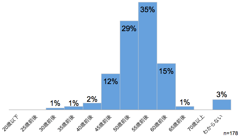「55歳前後」 の回答が最も多く、35%。次が 「50歳前後」 で29%となった。