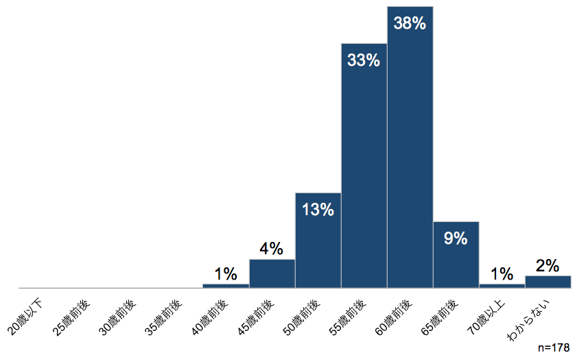 「60歳前後」 の回答が最も多く、38%。次が 「55歳前後」 で33%となった。
