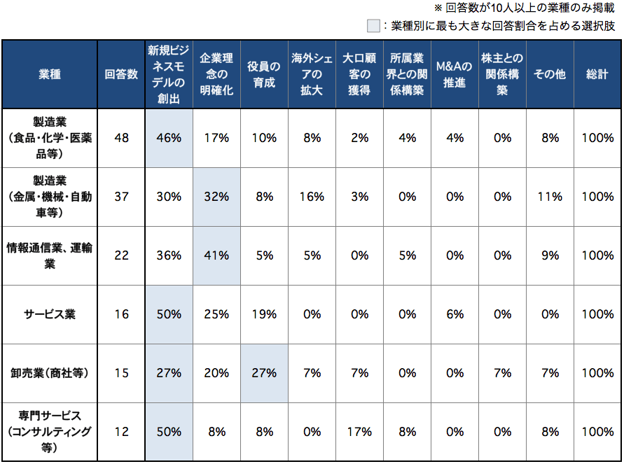 また、「企業理念の明確化」 については、「情報通信業、運輸業」 41%、「製造業(金属・機械・自動車等)」32%と割合が大きく、それぞれの業種内では一番選ばれた項目となった。「役員の育成」 については、「卸売業(商社等)」では27%と一番選ばれた項目となっており、サービス業の19%が続く結果となっている。