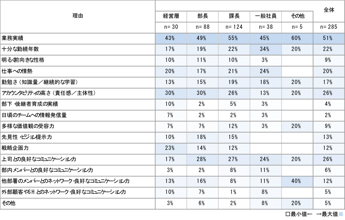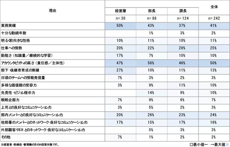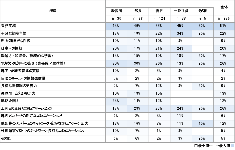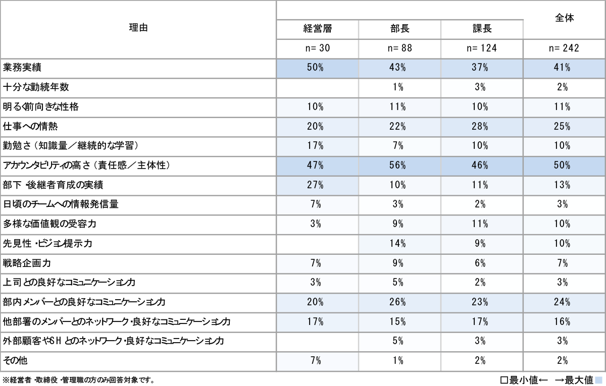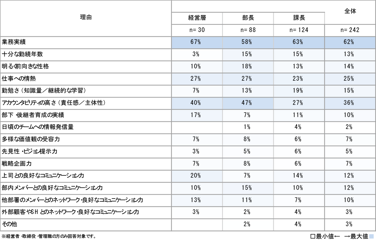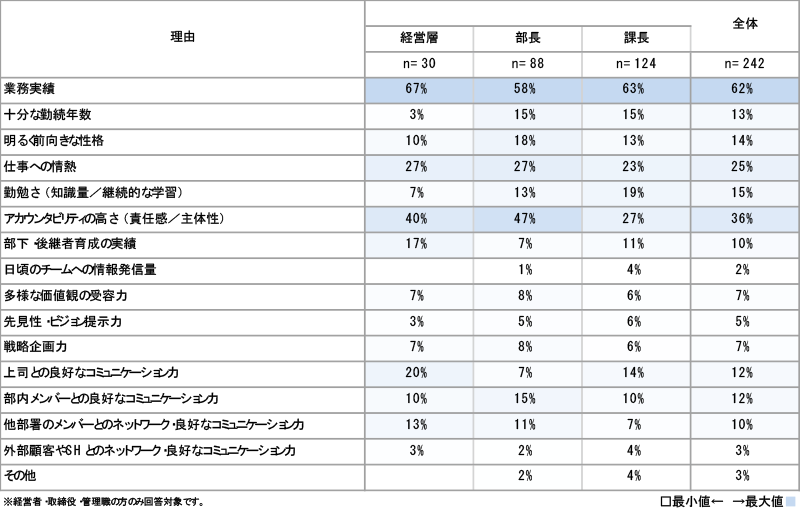 全ての役職で 「業務実績」 と 「アカウンタビリティの高さ(責任感/主体性)」が上位項目でした。「業務実績」 は、役職が高くなるほど昇進理由として重要視される割合が高まっています。