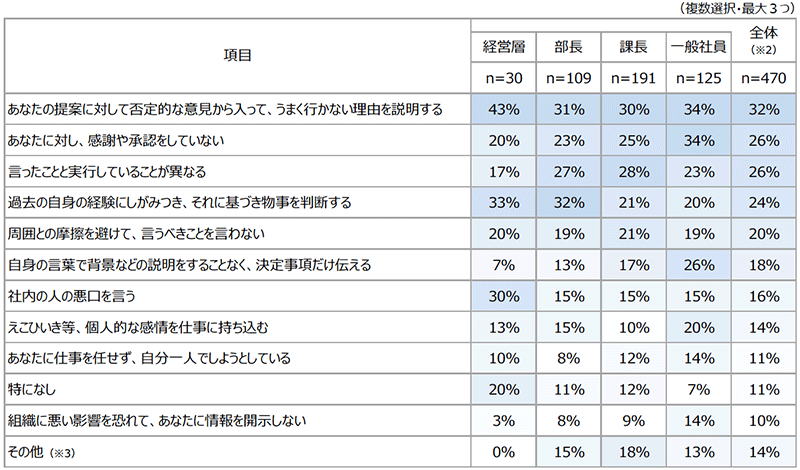 経営層から一般社員まで、「あなたの提案に対して否定的な意見から入って、うまく行かない理由を説明する」が上位二位以内に選ばれ、全役職において30%以上の回答者に選ばれている。また、経営層と部長では、「過去の自身の経験にしがみつき、それに基づき物事を判断する」が上位二位以内へ入っている。部長と課長の中間管理職においては、「言ったことと実行していることが異なる」が上位三位以内に入っており、上司に、より発言と実行の一致を求めていることがうかがえる。一方、一般社員は、「感謝や承認」や「決定事項の背景説明」がないと、モチベーションが下がると回答した割合が他の役職より高いことがわかった。