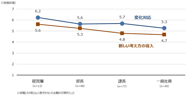 - 役職が高いほど「変化対応」や「新しい考え方の導入」を行っている実感が強い。