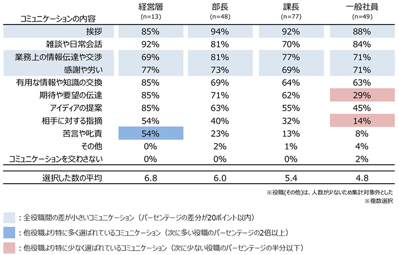 各コミュニケーションが選択された割合を役職間で比較すると、役職間の差が小さい(最多と最少の差分が20ポイント以内)のは「挨拶」「業務上の情報伝達や交渉」「雑談や日常会話」「相手に対する指摘」だった。つまり、異なる部署でのこれらのコミュニケーションは、役職間での違いが表れにくいことがわかった。