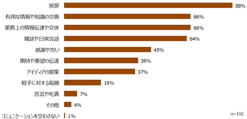 選択された内容の上位3つは、「挨拶」「雑談や日常会話」「業務上の情報伝達や交渉」だった。同じ部署で、これらのコミュニケーションが多く行われていることがうかがえる。一方、選択された内容の下位3つは、「苦言や叱責」「相手に対する指摘」「アイディアの提案」だった(「コミュニケーションを交わさない」「その他」を除く)。なかでも、「苦言や叱責」「相手に対する指摘」は50%未満であり、同じ部署では特に多く行われていないことがわかった。また、各回答者のコミュニケーション内容の選択数の平均は、5.4種類であった(「その他」と「コミュニケーションを交わさない」を除く)。
