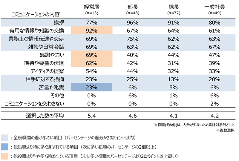 同じ部署におけるコミュニケーションについて役職別の特徴を調べたところ、役職が高いほどコミュニケーションの種類数が多い傾向にあった。つまり、役職が高いほど様々な種類のコミュニケーションを職場で行っていることがわかった。また、各コミュニケーションの種類が選択された割合を役職間で比較すると、「挨拶」「業務上の情報伝達や交渉」「感謝や労い」で役職間の差が小さかった(最多と最少の差分が20%以内)。これらのコミュニケーションは役職間での違いが表れにくいことがうかがえる。