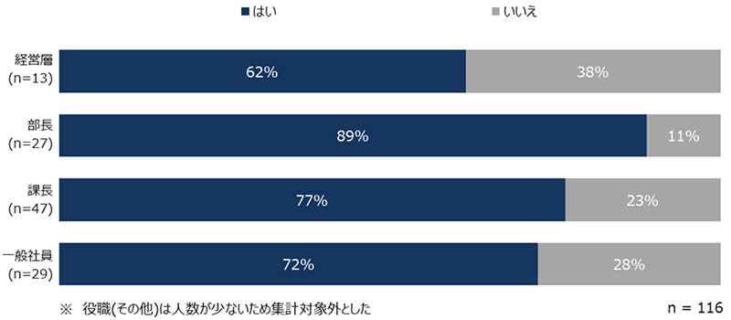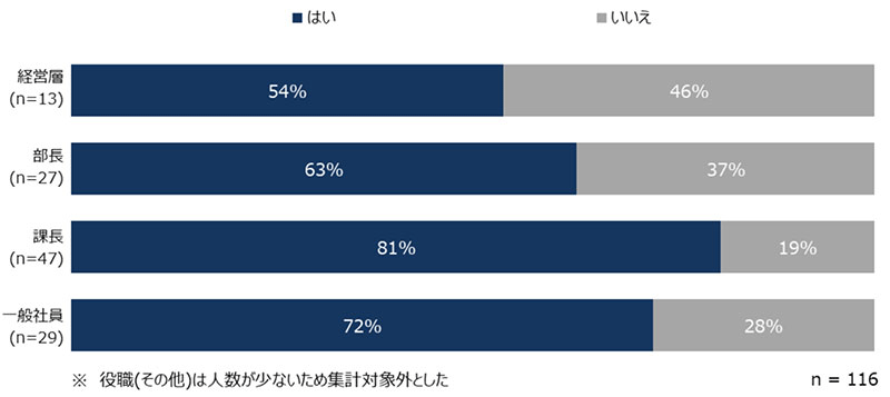 上司にブラインドスポットがあると回答した人は72%であり、問1の自分自身のブラインドスポットとほぼ同じ値になった。 課長層は81%と一番高く、経営層が54%と一番低い結果であった。