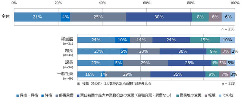 全体で、最も多い変化は、「責任範囲の拡大や業務役割の変更(役職変更・異動なし)」で30%を占めた。役職別では、全体と傾向が異なる。