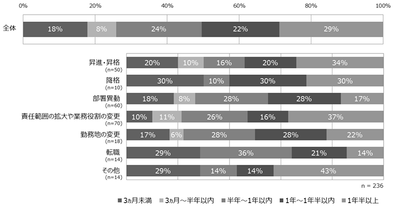 全体で、最も多い時期は、「1年半以上」で30%を占めた。変化の内容別では、全体と傾向が異なる。