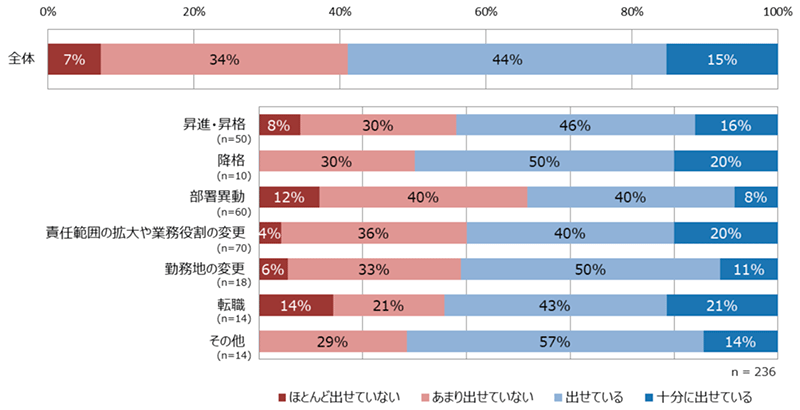 全体の回答では、59%がポジティブ回答(出せている・十分に出せているを選択)、41%がネガティブ回答(あまり出せていない、ほとんど出せていない)であった。変化の内容別にみると、「部署異動」以外は、ポジティブ回答がネガティブ回答を上回る結果となっている。