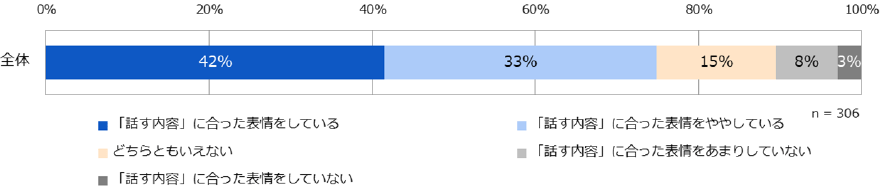 部下に対する表情で最も多い回答は、『「話す内容」に合った表情をしている』で42%。ポジティブ回答(『「話す内容」に合った表情をしている』もしくは『「話す内容」に合った表情をややしている』)は75%であった。