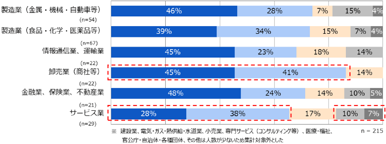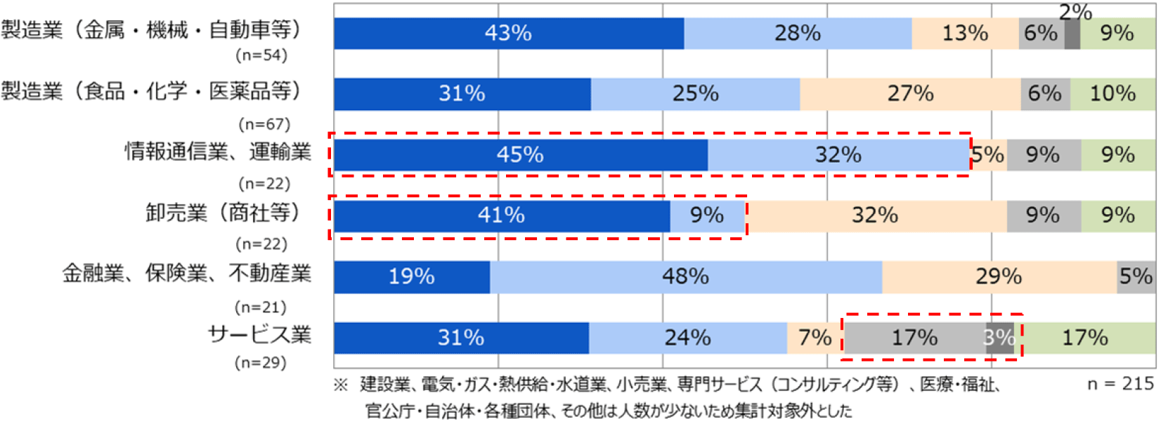 ポジティブ回答が最も多い業種は「情報通信業、運輸業」の77%。これは、全体の結果(図9)に比べて14%高い。