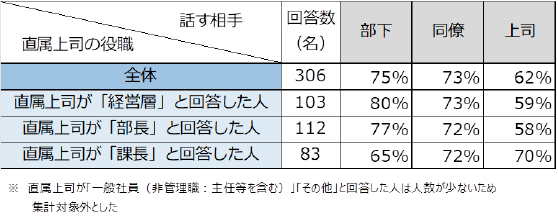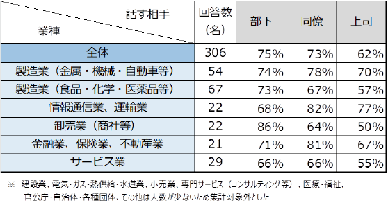 - 「部下」「同僚」「上司」の話す相手によって15%以上の差があったのは、製造業(食品・化学・医薬品等)と卸売業(商社等)である。いずれの業種も、全体と同様の傾向で、「部下」の値が高く、「上司」が低い。