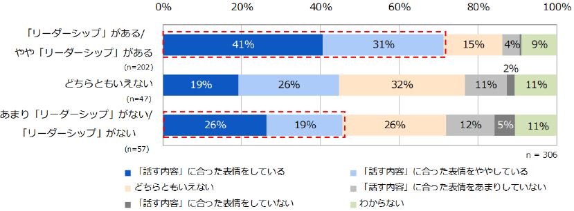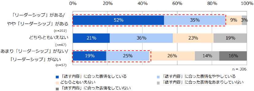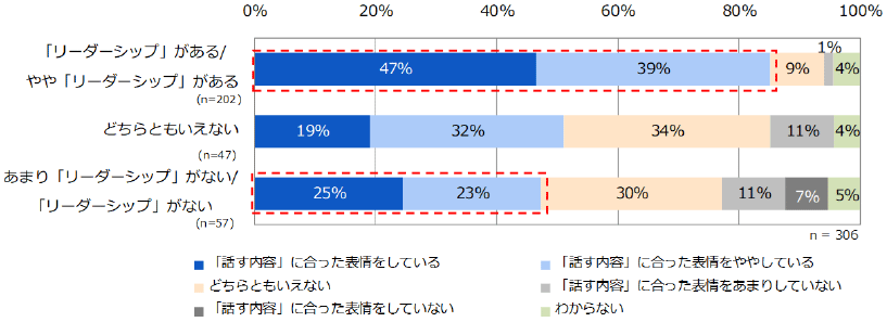「直属上司のリーダーシップ」を高く評価した人のうち、ポジティブ回答をしている割合は87%と高かった。リーダーシップが高いと評価されている上司は、部下と話をするときに、「話す内容」にあった表情をしている人と思われていることが分かる。