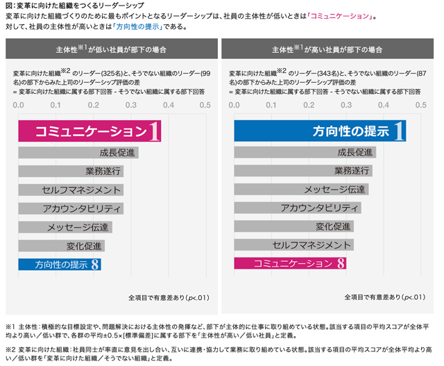 結果として「主体性が低いケース」においては、部下は上司に「コミュニケーション」を求め、「主体性が高いケース」では「方向性の提示」を求めていることが明らかになりました。 レポートの詳細、その他の図はこちらからご覧いただくことができます。