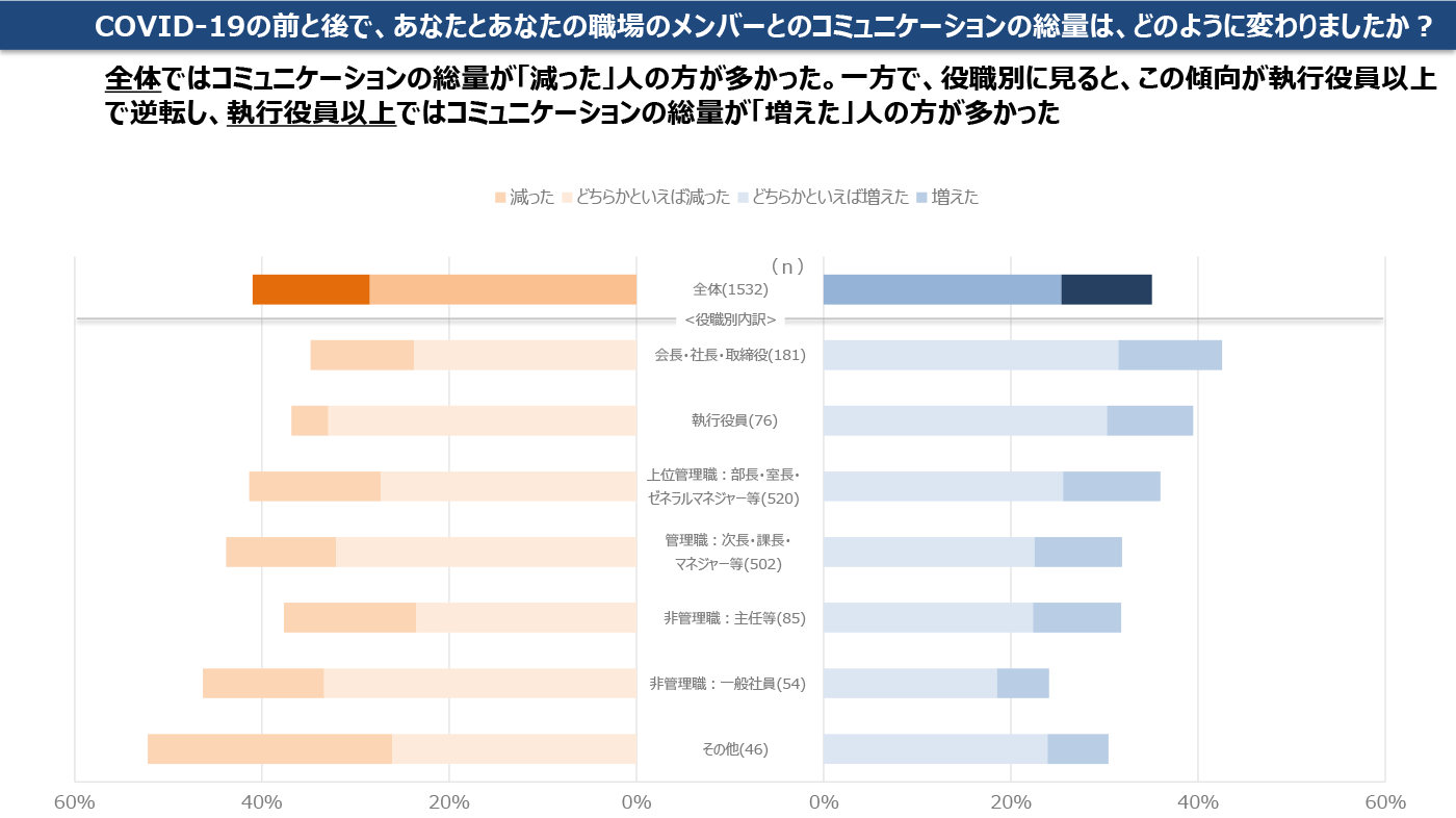- 職場におけるコミュニケーションの総量は減少傾向だが、執行役員以上は、これまでよりもコミュニケーションが増えたと回答している。
