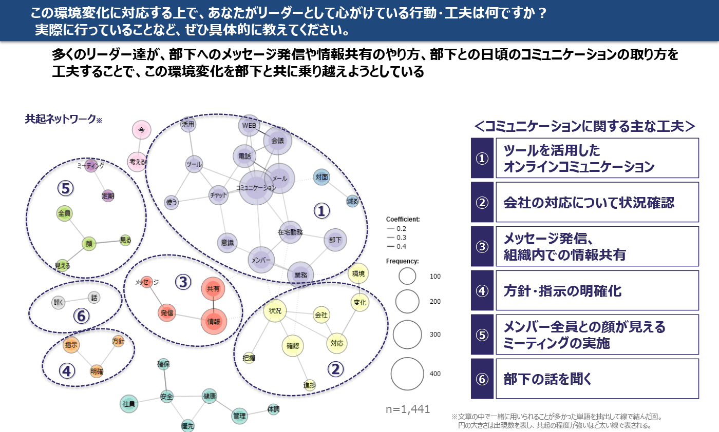 - 私にタイムリーに相談できなかったことで、自分自身でよく考えるようになった人もいる。上司に頼る時間が減ることで各人は成長せざるを得ないことを感じていると思う。