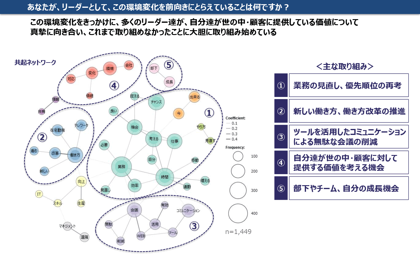 - 既存ビジネスや業務の進め方や働き方の見直しなど、成長機会と捉えているリーダーも多い。