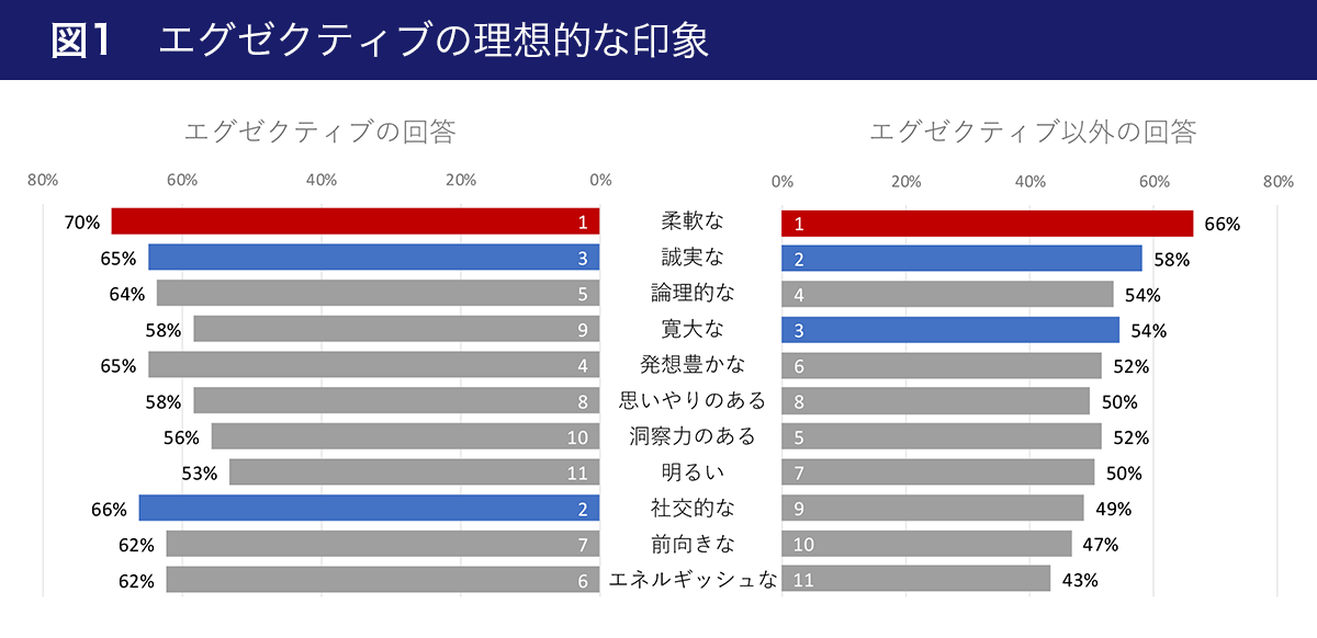 - 1位:柔軟な:エグゼクティブ 70% / エグゼクティブ以外 66%(1位)