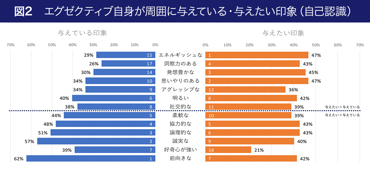 エグゼクティブ自身が周囲にどのような印象を与えていて、また与えたいと感じているかについては次のものが上位に並びました。