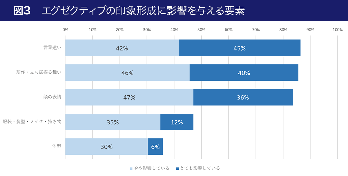 エグゼクティブの印象形成に影響する要素としては「言葉遣い」、「所作・立ち居振る舞い」、「顔の表情」が上位にあげられました。
