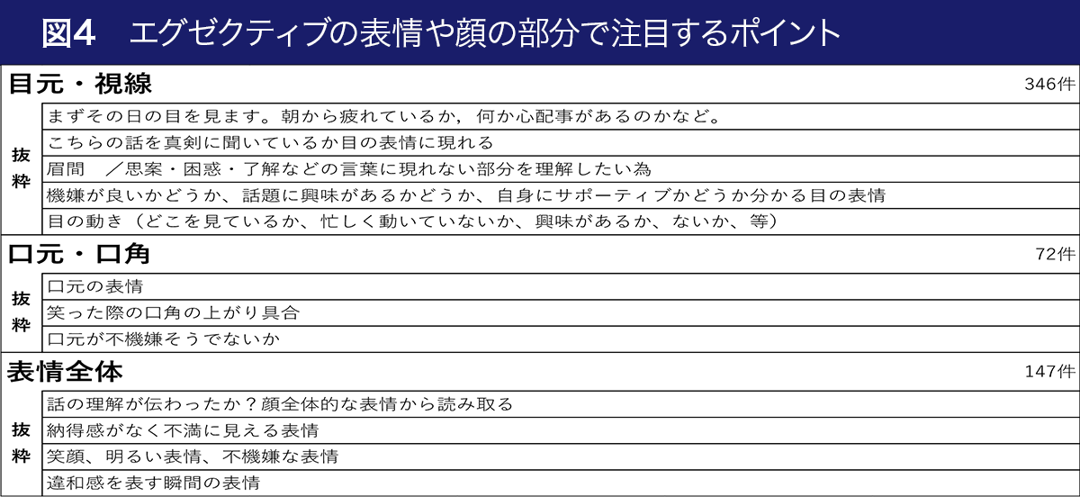 エグゼクティブと会話をする時に、どのような表情や顔の部分に注目するかについては「目元」や「口元」、表情全体があげられました。マスク着用の機会が増えている昨今、目元や視線に一層注目している、というコメントも見受けられました。