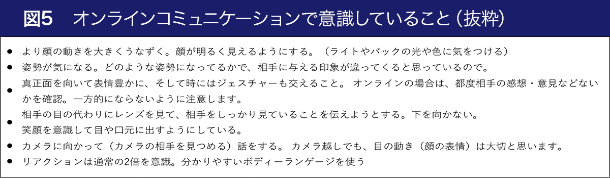 リモートでのコミュニケーションにおいて、エグゼクティブは顔の表情だけではなく、顔の向き、うなずき、体の姿勢やジェスチャーなどを工夫しています。カメラとマイク越しでも最大限に、相手の存在や発言に関心を持っているということを伝えようとしていることがわかりました。