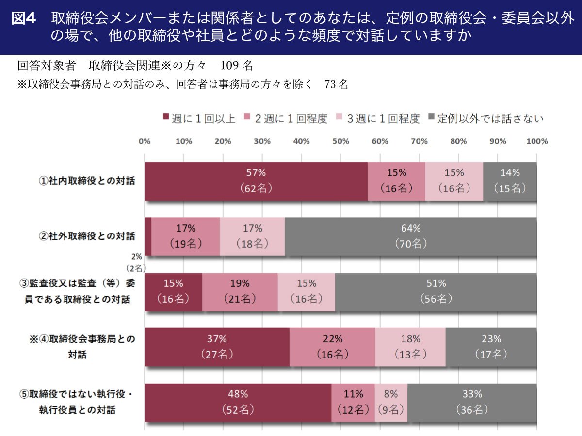 取締役会関係者が対話している相手は社内の取締役が最も多く、次に執行役員という結果でした。社外取締役とは定例会議以外ではあまりコミュニケーションの機会を設けていない関係者が多いことがわかりました。