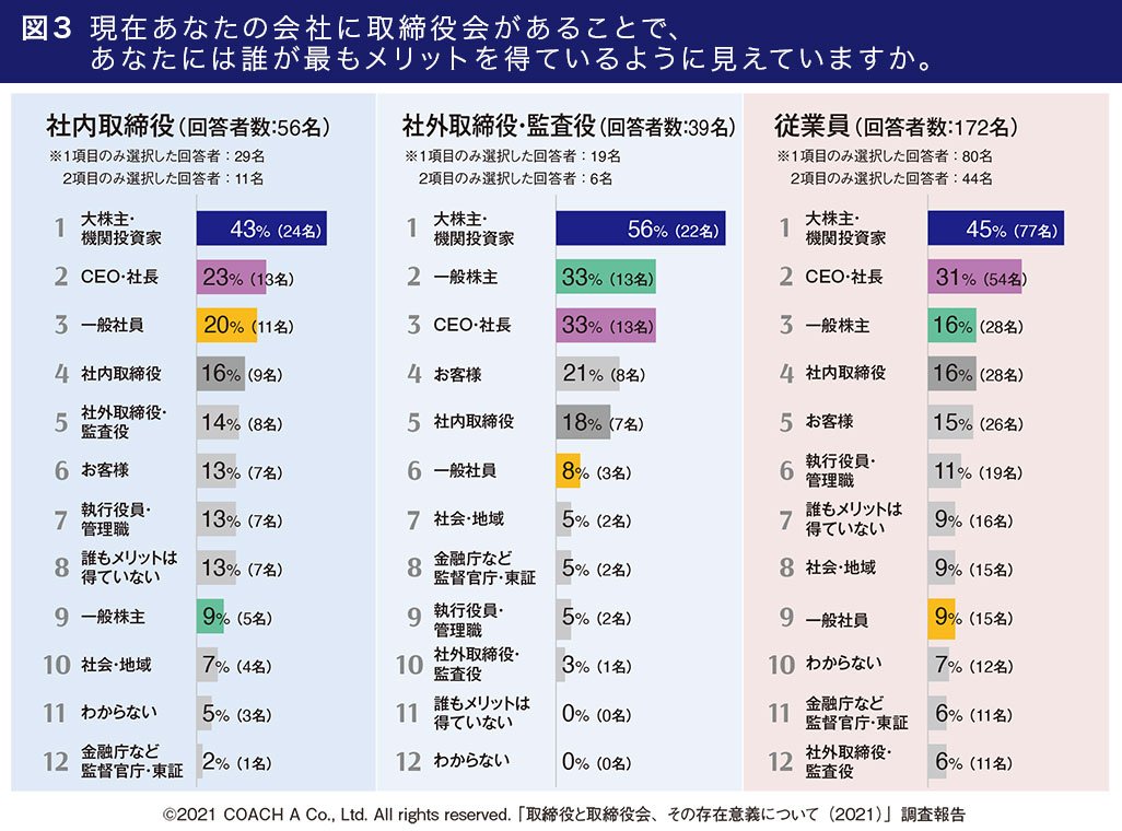 「現在、会社に取締役会があることでメリットを得ているのは誰か?」という調査では、全体結果を、社内取締役、社外取締役・監査役、従業員の3つの回答者属性別で集計した結果<図3>、回答者の属性による興味深い違いがみてとれました。まず「一般株主」に関して、社外取締役・監査役で本項目を選択した人の割合が3割強だったのに対し、社内取締役は1割弱しか選択していません。また、社内取締役の回答で「一般社員」にメリットがあるとしたものは3位に位置しましたが、取締役会が自分達「一般社員」に利益をもたらす主体であると見えていると回答した従業員は1割未満でした。