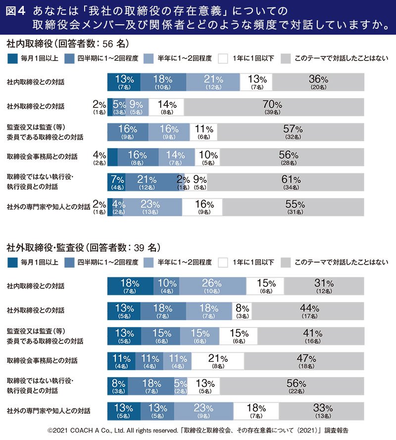 取締役会関係者である社内取締役、社外取締役・監査役、取締役会事務局が、「我社の取締役会の存在意義」について日頃、誰とどれくらい対話しているのか、を調べた結果が<図4>です。