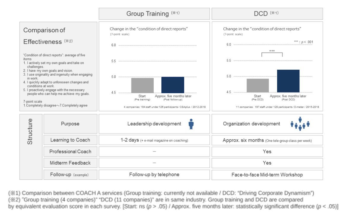- Supporting Leaders become Coaches: Rather than coaching individual leaders to improve their leadership skills, we support leaders to become coaches who can develop others to become the next leaders and create "dialogue" to transform the current organization together.