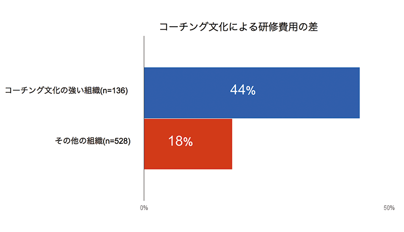 全体として、回答者の所属する組織における研修費用のうち23%が、コーチングの取り組みに割り当てられていたことを示している。近年のHCI / ICF調査結果(2014年には11%、2015年には14%)と比較して、コーチングの取り組みに対する支出が、全体的に大幅に増加していることがわかるが、より強いコーチングカルチャーをもつ組織は、全体の研修予算のうちコーチングの取り組みに対して大幅に多く配分している。