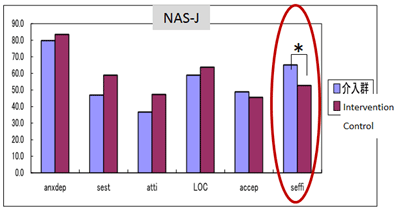 コーチングを始めて3ヶ月後の比較において、健康関連のQOLでは両群間に差はありませんでしたが、心理的適応(NAS-J)における自己効力感は、コーチングを受けていたグループのほうが明らかに向上していることがわかりました(下図)。