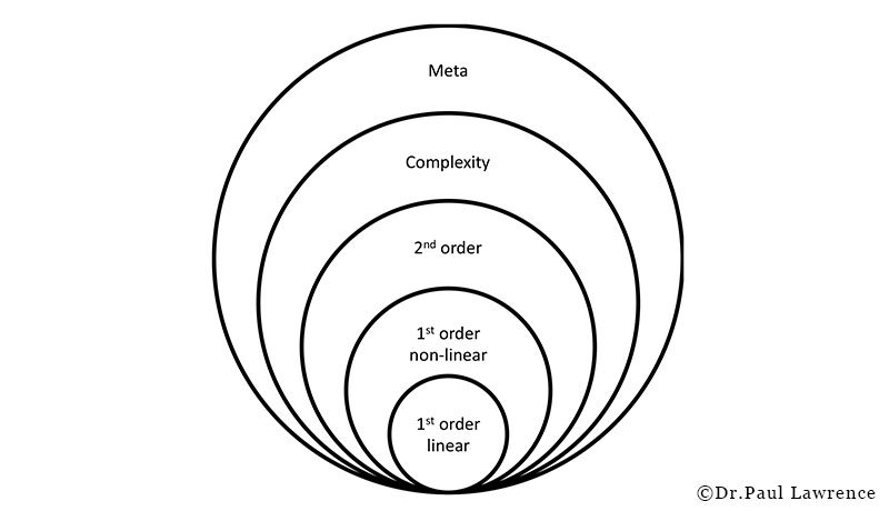 組織をシンプルな機械とみなして、リーダーは組織の外に立ってルール決める。リーダーは「コントロール」する役割。原因と結果が明確で、コーチングもトップダウンのアプローチ。 - 一次段階(非直線的な考え方)