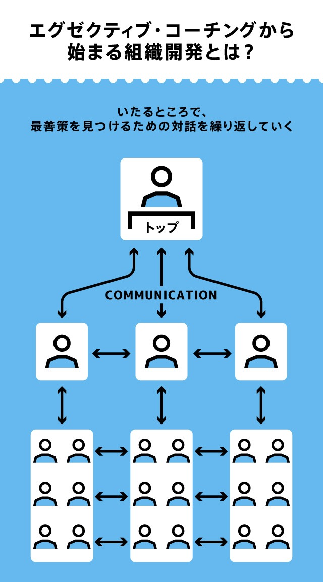 コーチ・エィでは人材開発に加え、企業のトップがコーチングを受けることによって、トップが自分と周囲の人との関わり方を見直し、組織全体を開発するアプローチを「エグゼクティブ・コーチング」と呼んでいます。