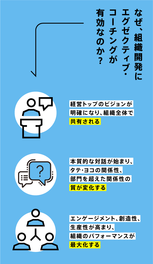 たとえば、「自分と周りの関わり方は組織としていいパフォーマンスを生むものなのか」、「社員のエンゲージメントを高める要素は何なのか」といった「問い」をコーチとの間に立てる。そして、最善策を発見するための対話を重ねていくのがエグゼクティブ・コーチングです。