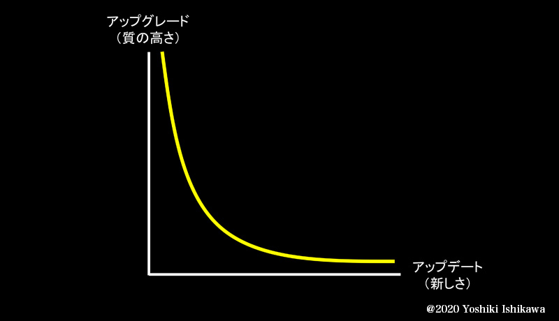 まず、どういう軸を取ったかと言いますと、一つが「アップデート」、すなわち新しくしていく軸。そしてもう一つが「アップグレード」、質を高めていくという軸です。「新しさ」と「質の高さ」は、トレードオフの構造になっていますが、こうしたトレードオフ構造の二軸は、立て方としてよい軸であることが多いです。
