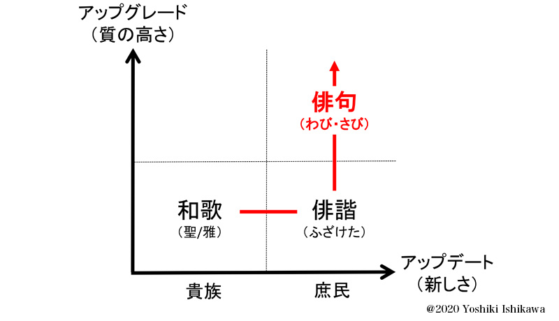 松尾芭蕉に話を戻すと、江戸時代には、すでに和歌があり、雅なるものとして蛙や鴬がありました。これをアップデートします。そのための一番簡単な方法は、ターゲットを変えることです。たとえば、平安の古から貴族は和歌を詠み、それを、より雅なるものへと質を高めていました。では、貴族が詠んでいた和歌を庶民が詠むとどうなるか。江戸時代、庶民たちはこの和歌を「俳諧」というものに変えました。季語も入らず、テーマも雅なるものではなく「蛙飛び込む」といった、ある種ふざけた、わかりやすいものにアップデートされたのです。