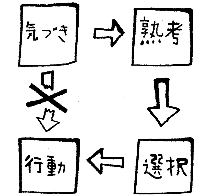 「気づけば行動は変わる」と思われているようですが、気づいただけでは行動は変わりません。〈気づき〉には、いわば暗闇をサーチライトで照らすような働きがあり、それは貴重なものですが、サーチライトで暗闇を照らしただけで行動が起こるわけではないのです。ライトに映し出されたものを見て、熟考し、選択する時間が必要です。〈熟考〉し、次に〈選択〉してはじめて行動に移すことができます。