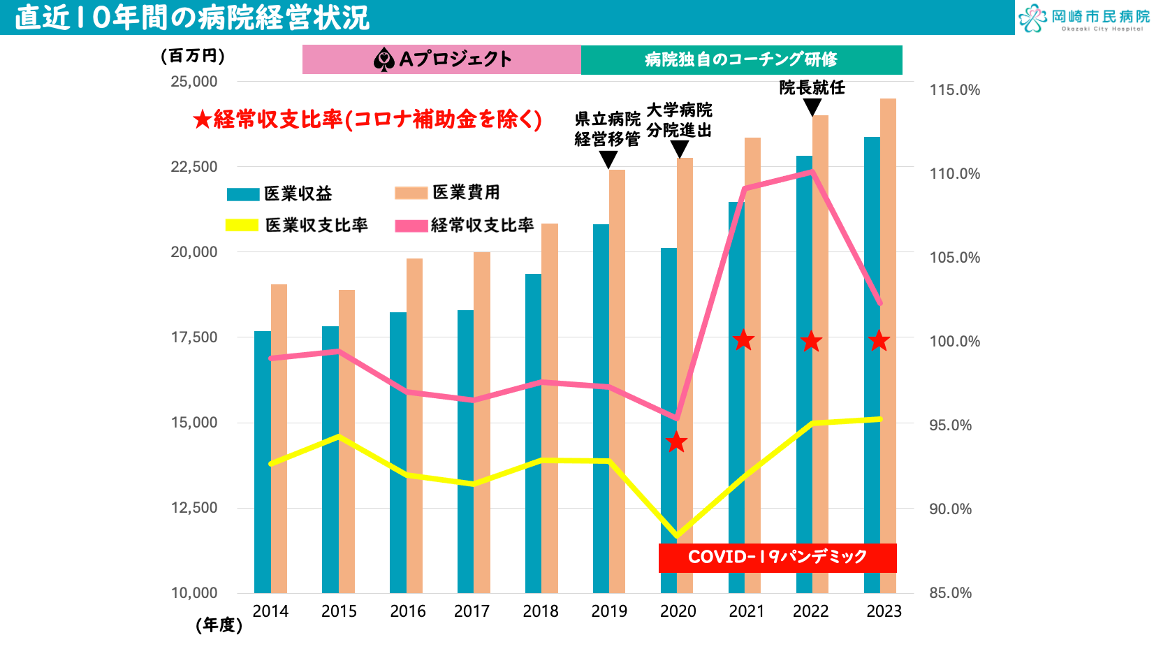 その環境変化の一つは、当院から1キロ圏内にある県立・愛知県がんセンター愛知病院との経営一体化です。愛知病院の経営が悪化し岡崎市に移管されたことで、2019年から岡崎市民病院との一体運用が始まりました。患者さんの移行はもちろん、県職員から市職員へと職員の異動もある中で、各部門のリーダーがスムーズな移行を成し遂げてくれました。