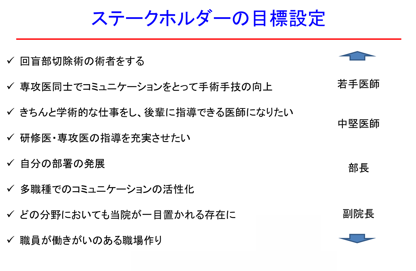 ステークホルダーに対するコーチングは、ステークホルダーが達成したいことに向けて目標設定をするところから始めました。ステークホルダーの目標設定をするのに最も大事なのは、プロジェクトの目的がしっかり定まっていることです。松山赤十字病院全体のプロジェクトの目的は、「松山赤十字病院で働くことにやりがいと誇りを感じ、活躍の場を広げるリーダーが増えていくために、コミュニケーションを大事にする文化を根付かせる」ということです。この目的に向けて、ステークホルダーがそれぞれの立場で目標を立てます。たとえば若手の医師であれば、回盲部切除の術者をする、専攻医同士でコミュニケーションをとって手術手技を向上させるといったもの。中堅医師であれば、後輩にきちんと指導できるようになること、部長レベルであれば、自分の部署の発展、他職種とのコミュニケーションの活性化、そして副院長レベルであれば、どの分野でも当院が一目置かれる存在になる、職員が働きがいのある職場にする、といったことが目標になりました。